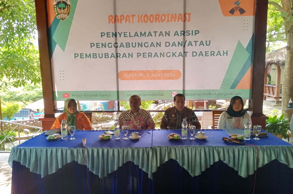MADIUN – Pemerintah Kabupaten (Pemkab) Madiun melalui Dinas Perpustakaan dan Kearsipan (Disperpusip) Kab. Madiun melaksanakan rapat koordinasi (Rakor) ‘Penyelamatan Arsip Penggabungan dan/atau Pembubaran Perangkat Daerah’ di ruang pertemuan salah satu taman wisata kawasan kresek, Kec. Wungu, Kab. Madiun.