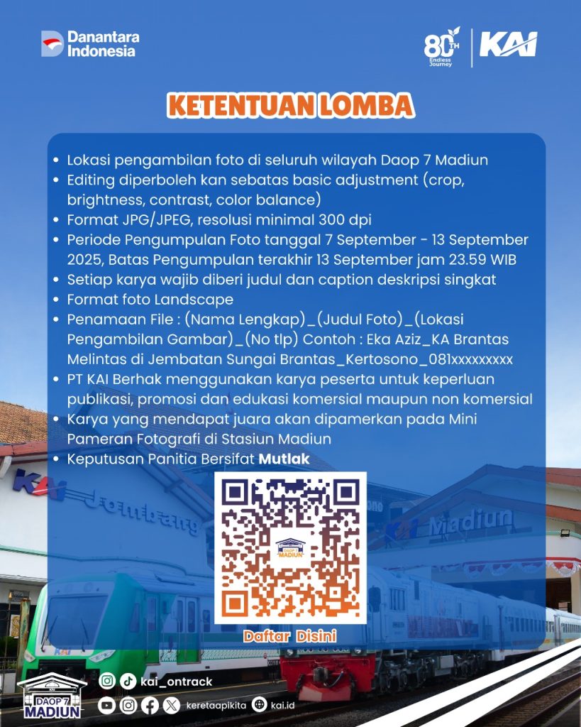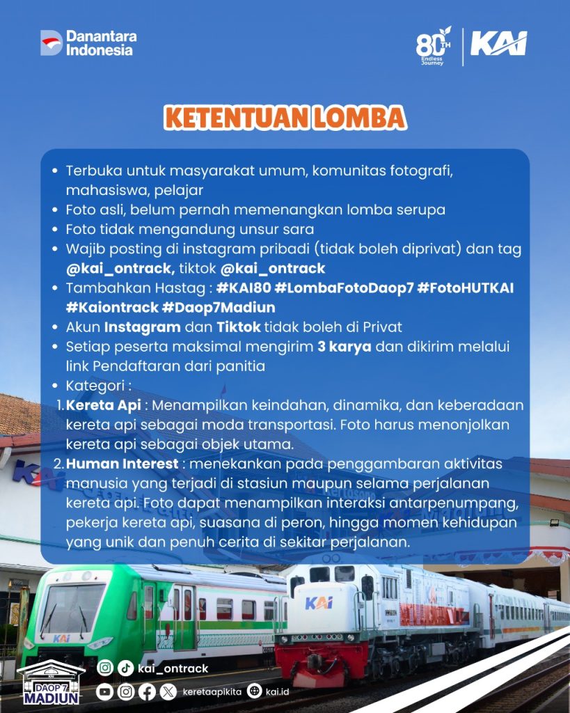 “Informasi lebih lanjut mengenai syarat dan ketentuan, serta jadwal pelaksanaan lomba dapat dilihat di media sosial resmi KAI Daop 7 Madiun yaitu instagram @kai_ontrack dan tiktok @kai_ontrack. Ayo, abadikan momen terbaikmu dan jadilah bagian dari perayaan HUT ke-80 KAI,” pungkas Zainul.*(sumber:humaskaidaop7)